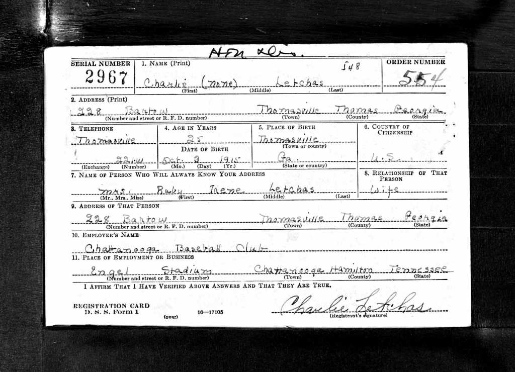 Charlie Letchas was the son of Greek immigrants. His father, George Letchas, immigrated to the United States in 1904 and seven years later opened the Greek-American Restaurant in Thomasville, Georgia. Location matters. By the time Charlie was born in 1915, Thomasville had already become a frequent spring training host for Major League and minor-league teams, which surely fostered the Letchas boys’ attraction to the game.