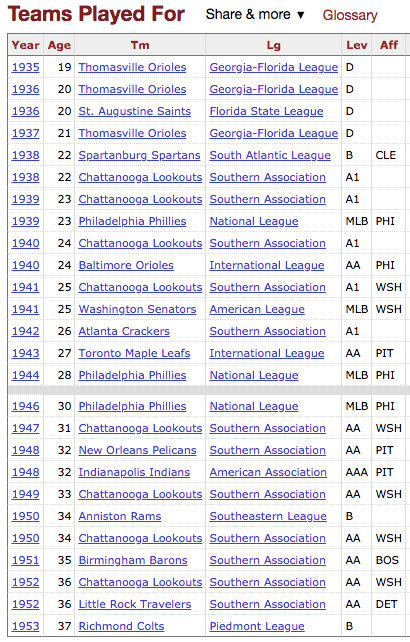 In 1940 he played one game for Baltimore (then an International League team) and virtually the entire season with Chattanooga, hitting .261. In 1941 he played 153 games with Chattanooga before the American League’s Washington Senators added him to their roster at season’s end.
