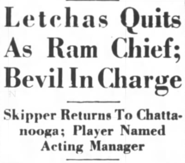 Letchas, then 34 years old, managed the Rams for 56 games — a 17-39 record. And then he quit, on June 14, 1950, after the Rams dropped a doubleheader against Vicksburg. Letchas’ reasoning was blunt. He quit, The Anniston Star newspaper reported, because “the club isn’t going good and the strain of managing is affecting my playing.” And with that, Letchas returned to the Chattanooga Lookouts, one of his longtime landing spots.