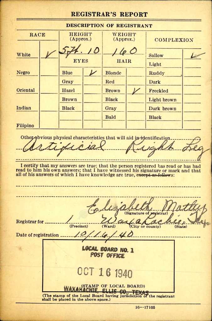 There is no record in The Anniston Star’s archives of Adair ever making that trip. In 1940 when he filled out his World War II draft registration card, he wrote in “artificial right leg” when asked about physical characteristics that would aid in identification. He remained in Texas, married a few times, became a father several times over and died in 1998. Richard Thomas Adair is buried in Hillcrest Burial Park Cemetery in Waxahachie.