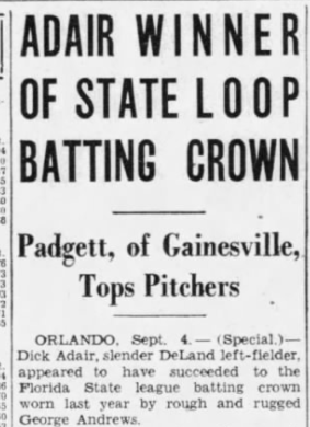 After playing semi-pro baseball the following summer, Adair signed in 1936 with the Gainesville, Florida, G-Men of the Class D Florida State League. Unbothered by his cow-blood bath or a year in sandlot games, he hit .285 with 15 doubles in 117 games. His breakout came the next year with the DeLand Red Hats, a FSL team affiliated with the Cincinnati Reds, where he led the league with a .334 average, 21 doubles and five triples.