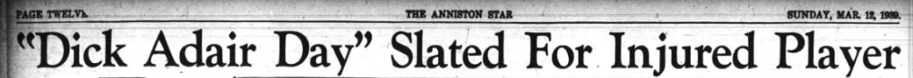 The Rams declared April 14 to be “Dick Adair Day,” when they would host a team from Samoset Mills in Talladega for an exhibition and all ticket sales would go toward Adair’s prosthesis. The Rams also wanted Adair to make the trip east. Mrs. Paul Thompson, who ran the boarding house on Wilmer Avenue where Adair stayed during the 1938 season, even offered to house and feed her former boarder for free.