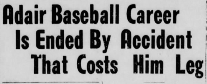 Adair, 27, climbed a tree on Sunday morning, Nov. 20, 1938, to scout for deer and dropped his shotgun, which fired when it hit the ground. The buckshot struck Adair near his right knee. His brother Elmer — also a minor-league player — rushed Adair to the hospital, where doctors gave him a blood transfusion and wondered if the leg was salvageable.