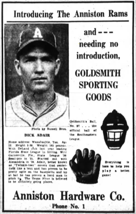 It was at Anniston’s Johnston Field where teammates began calling him “Twinkletoes.” He started in center and hit second in the Rams’ first game, a 5-3 win over the Gadsden Pilots, the SEL’s other 1938 expansion team. (Adair went 1 for 3 and scored one of the Rams’ first-inning runs.)