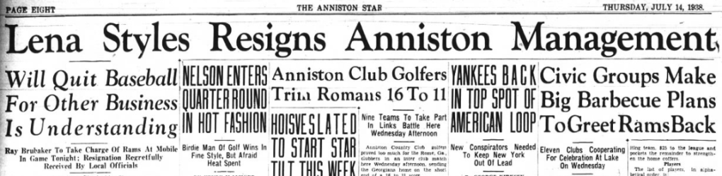 Picked to replace Styles was veteran minor league manager Ray Brubaker. The Rams won his debut, 9-2, over Mobile. The newspaper described the Rams the next day as an “inspired Anniston team,” which was rare in the summer of 1938.