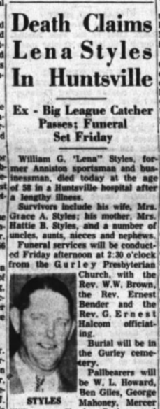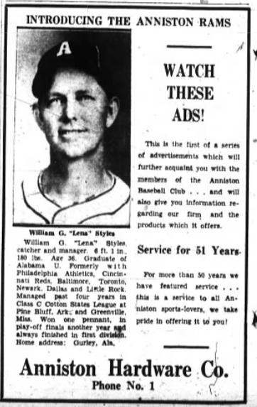 By January 1939 the former Anniston manager had partnered with Charlie Stanley and opened Styles-Stanley Service, a gas station and tire store in the heart of Anniston. (He also moonlighted as a a consultant to the ’39 Rams.) In the 1940s he opened his own shop, Lena Styles Tire Co., but by the summer of 1951 he was ready to go home to north Alabama and sold his business to Jack Barlow, who kept the former Major Leaguer’s name on the marquee.