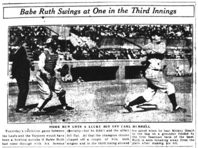 In 1926 as a member of the Toronto Leafs he caught a prospect (and future Hall of Famer) named Carl Hubbell in an exhibition against Babe Ruth and the New York Yankees.