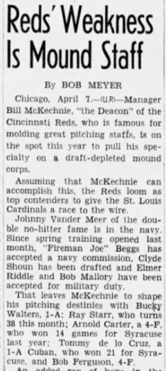 In 1944 the Reds needed pitchers because the U.S. military needed men for World War II, and military duty superseded Major League rights. Cincinnati’s staff, decimated by the draft, was filled that spring with minor leaguers and Reds not called by Uncle Sam.