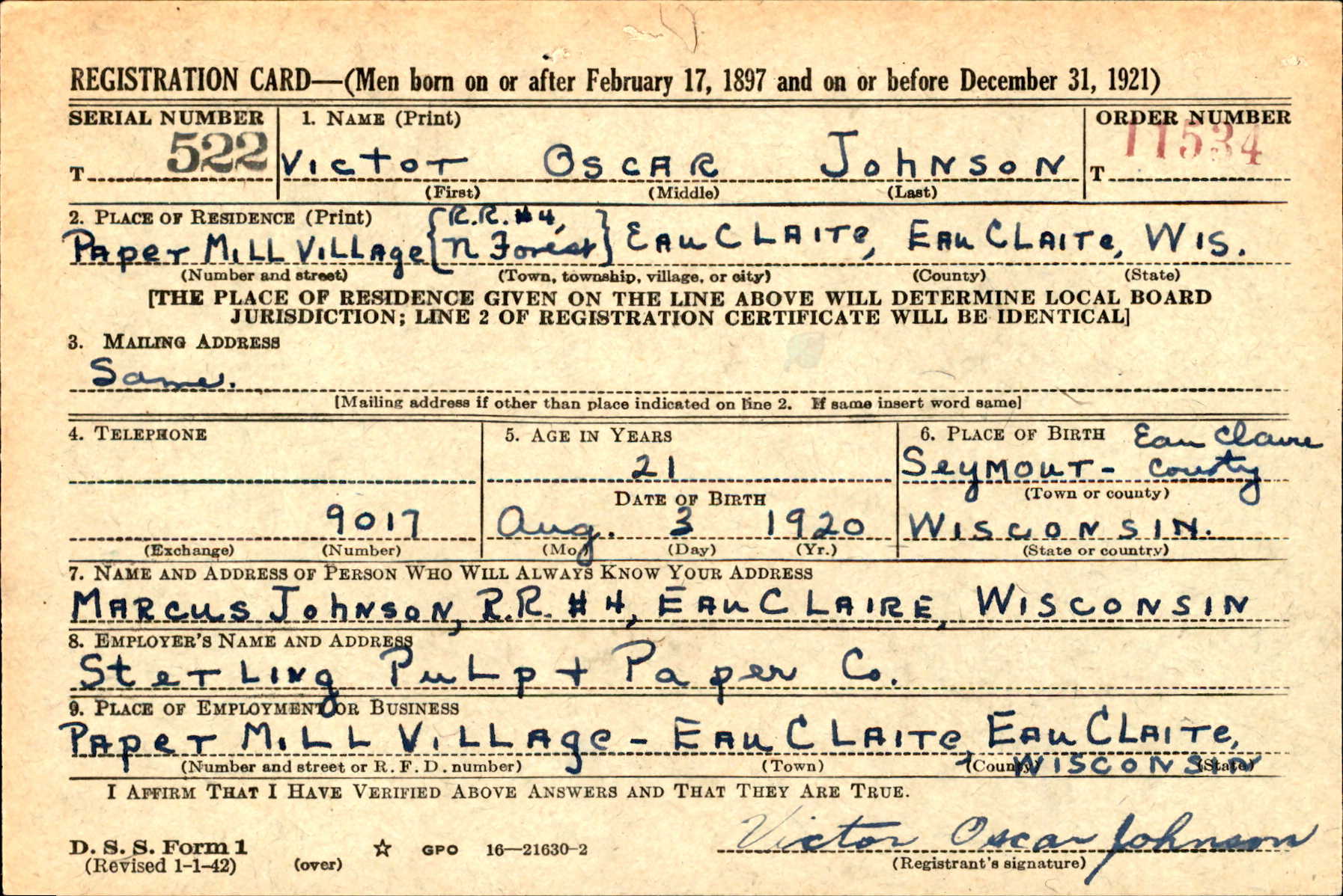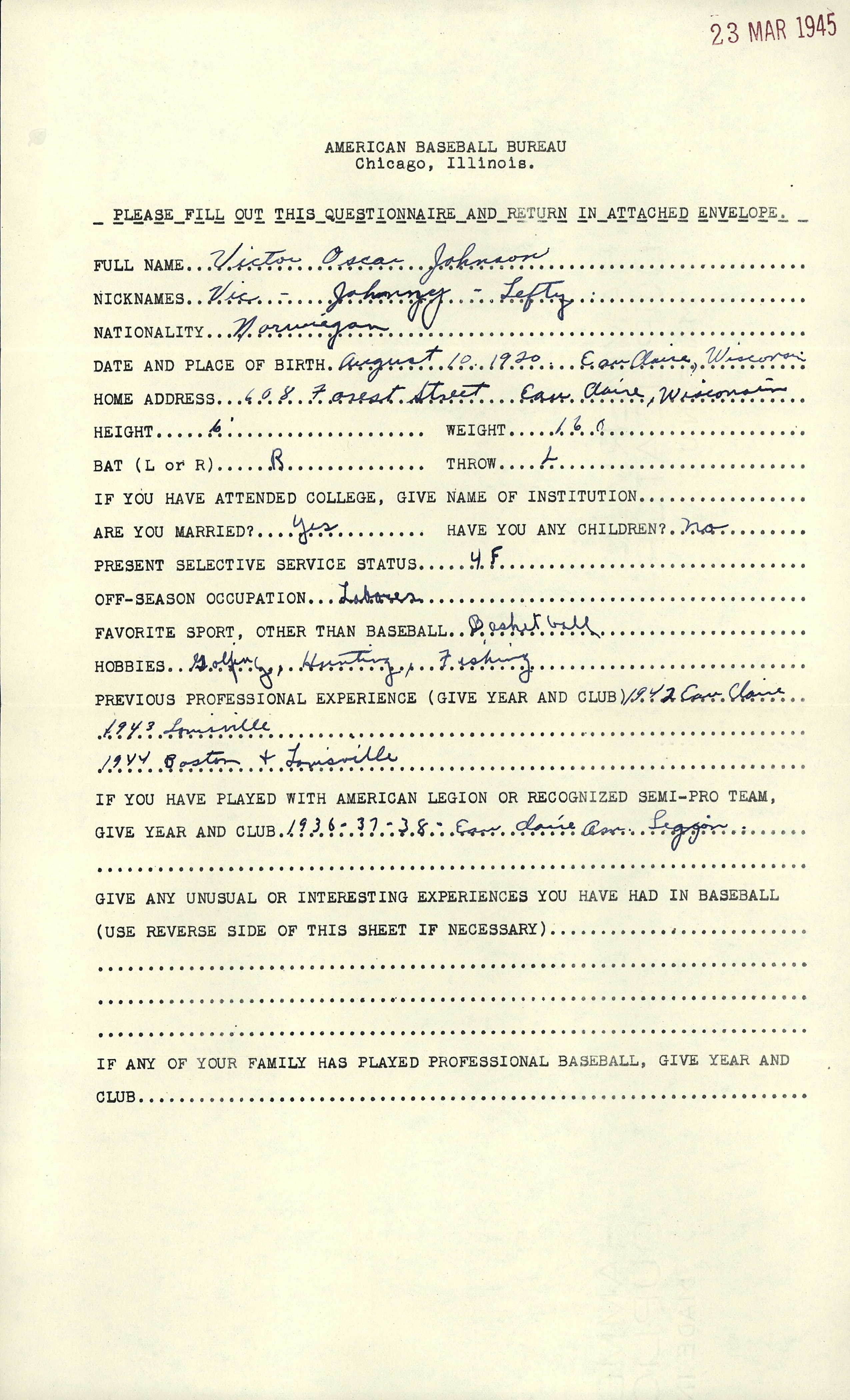 Vic Johnson’s baseball questionnaire and his World War II draft registration card. (Ancestry.com)