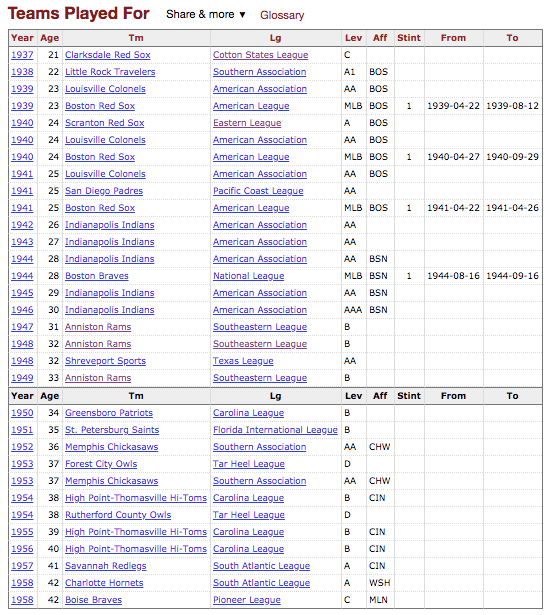 The Red Sox gave him chances in both 1940 and 1941, but he never regained his previous form. Boston’s National League entry — the Braves — called him up in 1944, hoping he’d excel in the game’s talent-depleted war years. But he didn’t. He pitched in seven games, started twice, and was shipped out again. His MLB days were over.