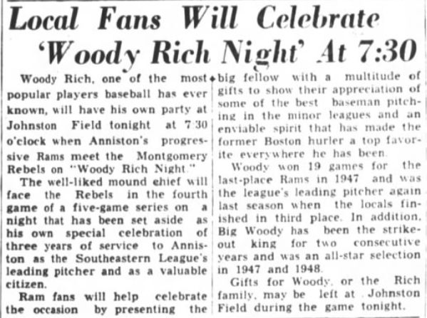 The 1949 Rams fell to sixth place, 64-74, though Rich did what he could. He won the season-opener (7-2 against Gadsden), won nine more games and posted a sub-3.00 ERA (a team-best 2.81). But he left the team — abruptly — in late July, not long after Rams management held a “Woody Rich Night” at Johnston Field to honor the fan favorite’s three years with the club.