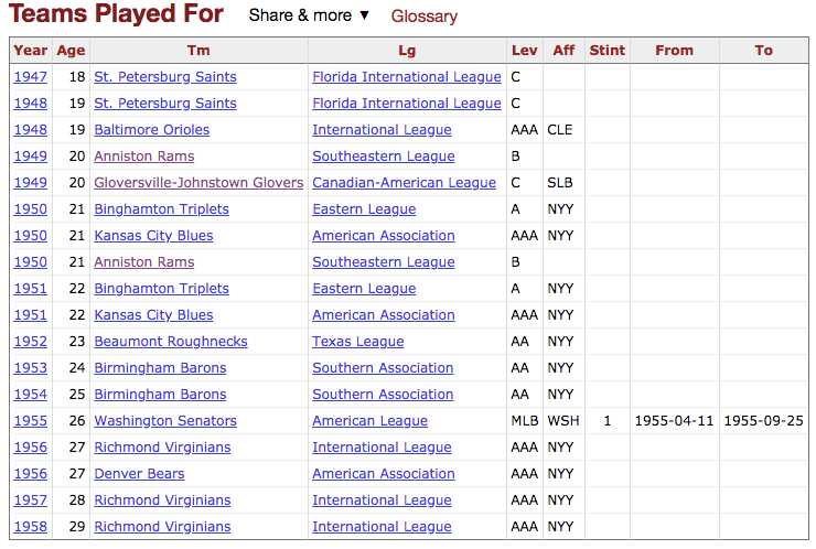 When the Senators traded him the following February back to the Yankees, it marked Kline’s third go-around with that organization: two official stints, and one as a high-school player way back when. But the Yankees never called him up from the minors, and he retired after the 1958 season, playing 1,272 professional games across all levels.