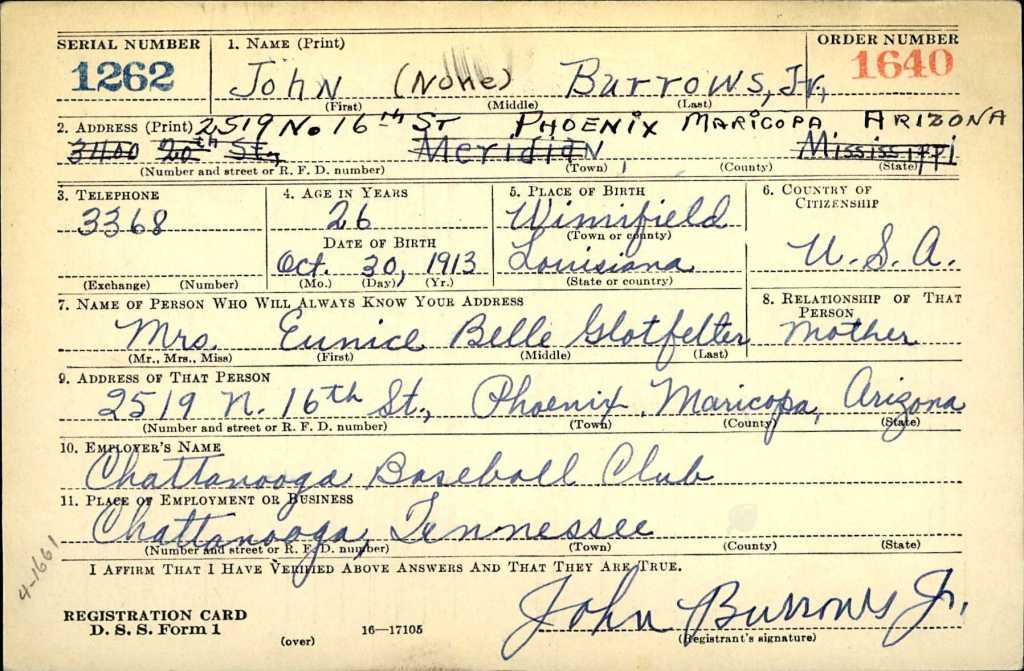 Born in Winnfield, Louisiana, in 1913, the 32-year-old Burrows arrived in Anniston in 1946, just as his career was beginning its unavoidable decline. He was, though, a former Major Leaguer, which provided a bit of panache. He tried out for the Detroit Tigers when he was only 13. (He didn’t make it.) When invited to the Washington Senators’ spring camp in 1933 as an 18-year-old, he quickly earned the reputation for calling everyone “mister,” a bit of verbal reverence that, according to the Chattanooga Daily Times, the big-leaguers thought was hilarious. They then walloped him for 10 hits and 11 runs in 4 1/3 innings of a 15-9 exhibition win over Chattanooga, one of their farm teams.