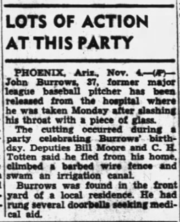 Burrows turned 37 on Oct. 30, 1949, only a few weeks after he threw his last professional pitch. During a birthday party that night in Phoenix, where he lived, he slashed his throat with a shard of glass from a broken bottle — and he survived, though the whole incident only gets weirder from here.