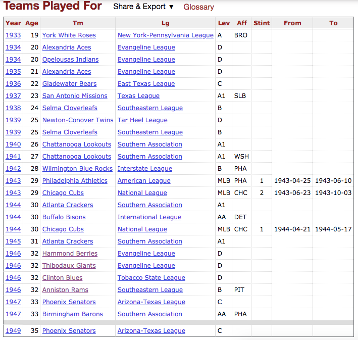 It took a decade for Burrows to meander through the minors, his stops coming in places like Opelousas, Alexandria, Gladewater, San Antonio, Selma, Chattanooga and Wilmington. He finally debuted in April 1943 for the Philadelphia Athletics in a 5-0 loss to the Senators, his start lasting just 1 1/3 innings. The A’s released him in mid-June and he signed with the Cubs — and wasn’t much better with them, going 0-2 in 23 appearances.