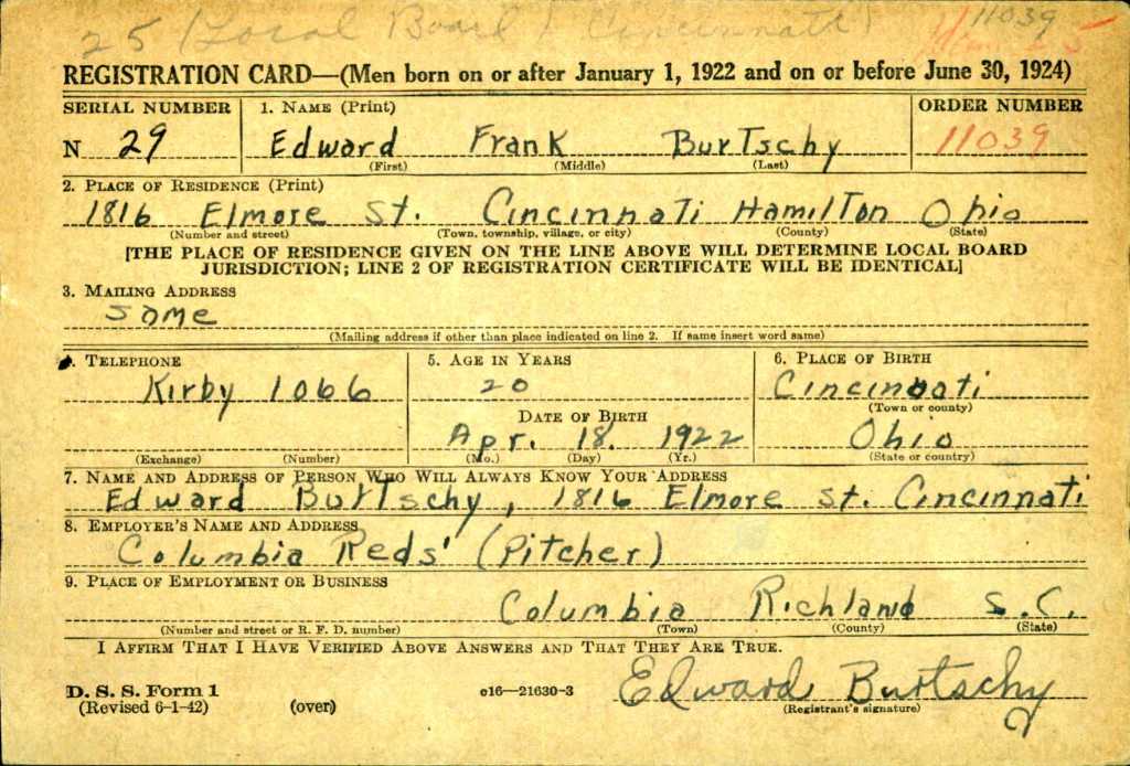 But the overarching story of Burtschy’s baseball career epitomizes 1940s America for the men and women who spent part of that decade in military service. War erupted and lives changed, including Burtschy’s. When he filled out his draft card, he listed his employer as the Columbia Reds, the National League’s Class B farm team in South Carolina. Born in Cincinnati, he enjoyed 14 professional seasons and five MLB stints that encircled his combat experience in the Pacific; neither prevented the other — but could have, had he been one of the U.S. Navy fatalities from the attack on the USS Ticonderoga in January 1945.