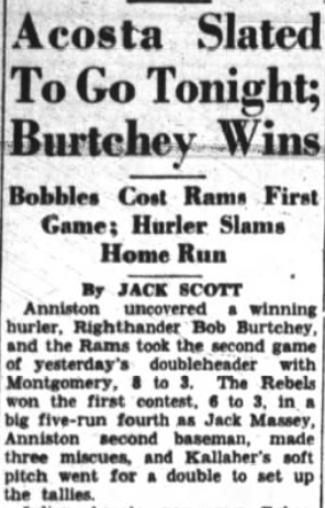“Anniston uncovered a winning hurler, righthander Bob Burtchey (sic), and the Rams took the second game of yesterday’s doubleheader … ” is how Anniston Star sports writer Jack Scott began his game story the following afternoon. (The Star never settled on the correct spelling of Burtschy’s last name.) Scott described the Ohioan as “amazing” when detailing his home run against the Rebels.
