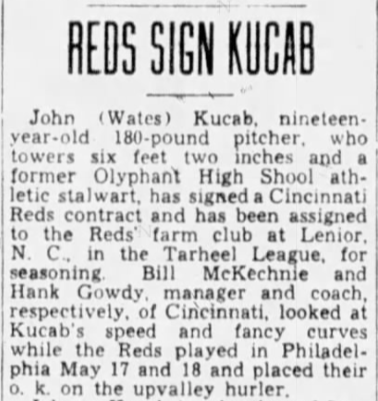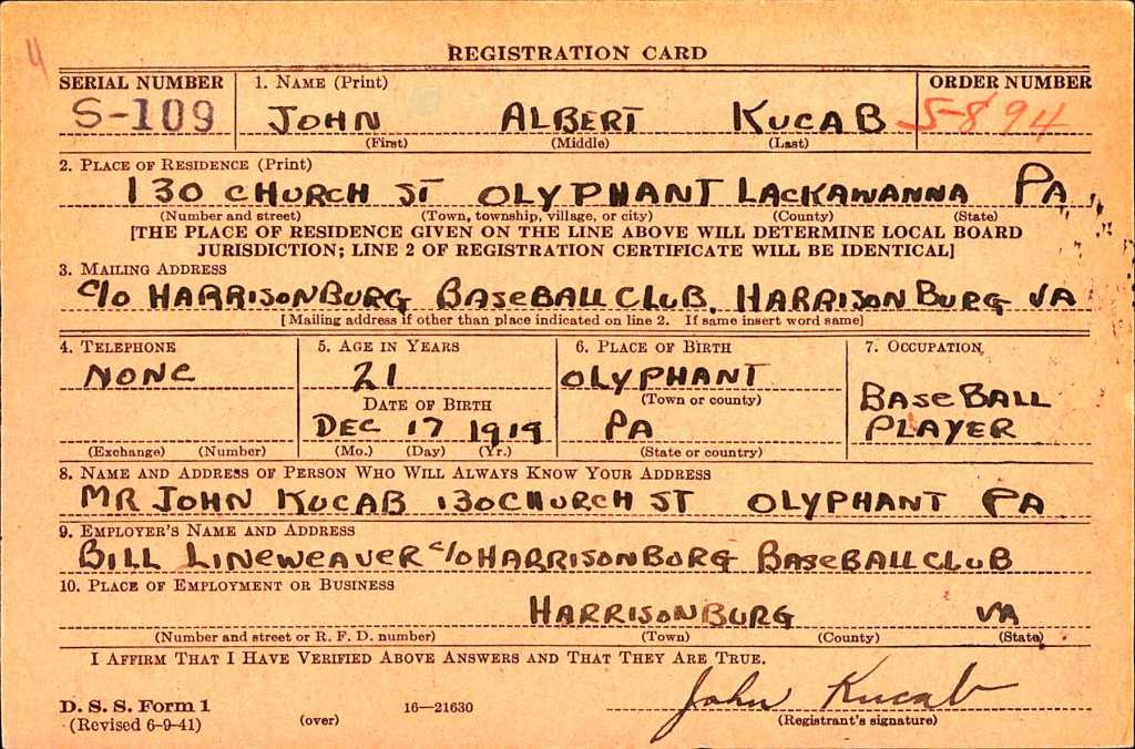 Before the war, Kucab was a man of options. He went to Miami (Ohio) University on a football and baseball scholarship but preferred professional baseball and signed with the Cincinnati Reds when he was 20. Limited to only one game in Class D Lenoir, North Carolina, after he cut his foot in a swimming accident, in 1941 he pitched 25 games for Class C Harrisburg, Virginia, and two more for Class B Columbia, South Carolina, before being drafted by the Army.