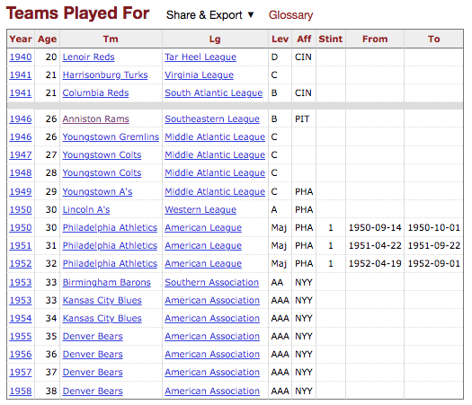 Kucab never pitched for the Yankees. They sent him to Birmingham, their Class AA team, that spring. Barons manager Mayo Smith didn’t mind. “I was impressed by Kucab’s work,” he said one day that March. “He showed the fine control that I heard he had. And from what I saw today, I think Johnny will be a big help to us.” He rose to New York’s Class AAA team, the Kansas City Blues, that summer and pitched for them the following year. When the franchise relocated to Denver to make room for the Athletics’ move to Kansas City, Kucab went with it to Colorado. He played four seasons with the Bears, giving him six seasons with the Yankees’ top farm team but not pinstripe call-up.