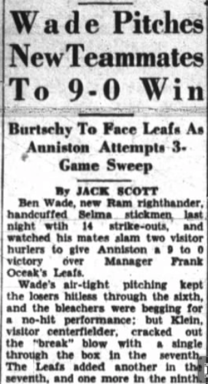 Zipp Newman, the Birmingham News sports editor, wrote that summer that Wade “was one of the finest-looking prospects in the Barons’ training camp” after dominating teams during his military stint. But in Birmingham he floundered, going 1-7 in 11 games in the season’s opening months, a victim of rust and lackadaisical run support. Sixty or so miles to the east, where Anniston team president Loy Gunter obsessed that summer over finding new talent for his underachieving team, the Rams provided Wade with a comfortable landing spot.