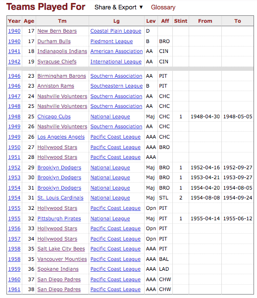 It’s a testament to Wade’s baseball arc that his Major League career isn’t his apex. He debuted briefly with the Cubs in 1948 and played two-and-a-half seasons with the Dodgers. In his first spring with the Dodgers, in 1952, Wade told a Nashville reporter that “I always could throw hard, as you know. Now I have finally come up with a good curve instead of that dinky wrinkle I used to throw.” The Dodgers didn’t use him in the 1952 World Series against the New York Yankees, but when they did in the 1953 World Series, the Yankees lit him up for four hits and four runs in 2.1 innings over two appearances. He spent another few months in 1954 with the St. Louis Cardinals, who shipped him to Pittsburgh that winter, and he was out of the big leagues, for good, after those last two innings at Forbes Field in 1955. His career MLB line: 19-17 over parts of five seasons, 10 saves, 4.34 ERA. He wouldn’t retire until 1961 after five-plus additional seasons in the minors.