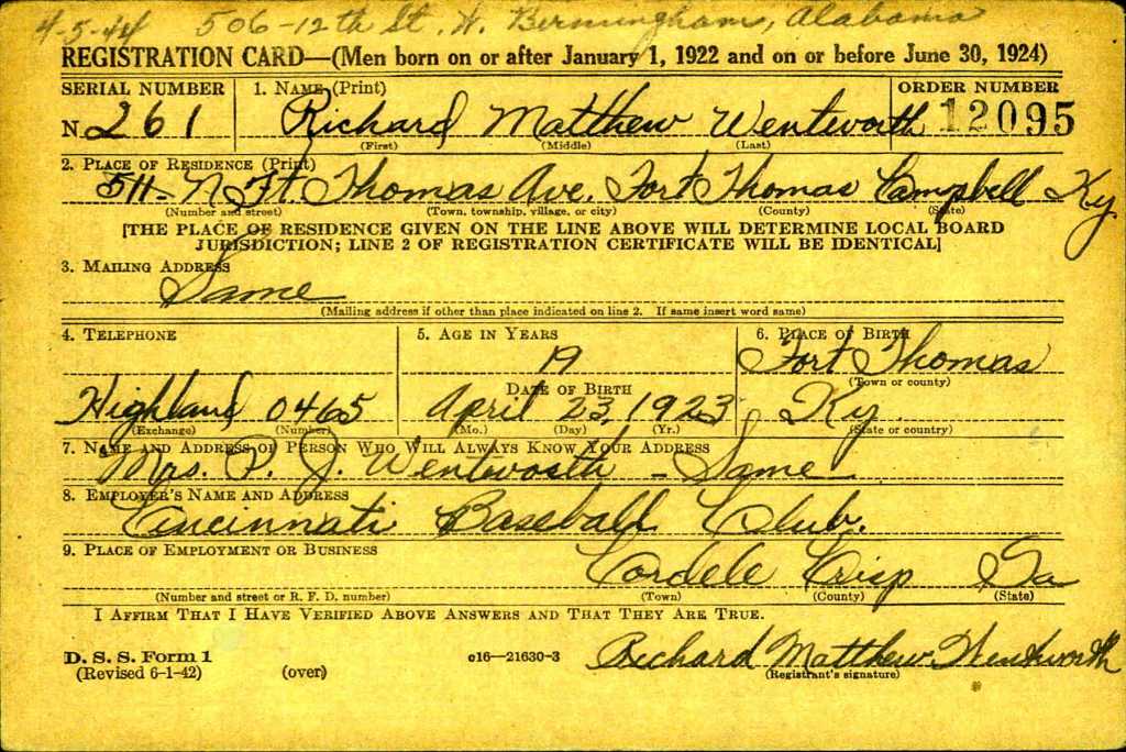 Dick Wentworth died in 1983 at age 60. He’s buried in Fort Thomas. His obituary in the Cincinnati Enquirer didn’t mention his baseball career.