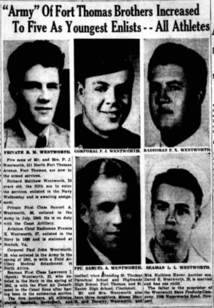 Born in Fort Thomas, Kentucky, just across the Ohio River from Cincinnati, Wentworth became a Reds farmhand when he was barely 17. Four of his brothers joined the military before and during World War II. Samuel Wentworth, the oldest, served with the Coast Guard artillery. Col. Paul Wentworth fought in World War II, Korea and Vietnam and is buried at Arlington National Cemetery. Francis Wentworth, an aviation radio chief in the Navy, died in an airplane crash at Naval Air Station Norfolk in 1943. Laurence Wentworth also served in the Navy.