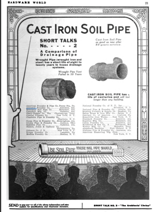 Decades later, in 1986, The Star examined the city’s historic foundries and the laborers who manned them. The story was stark and bleak, a document of a dying profession, yet somehow romantic. “Although the industry is just a shadow of its former self, former workers nostalgically remember when ramming pipe was the toughest job around and when 13 Anniston foundries provided most of the sewage pipe in the country,” the newspaper wrote. In the decades before and after World War II, Anniston’s foundries controlled roughly 65 percent of the U.S. business. The popularity of plastic pipe eventually melted that dominance, the memory of which the short-lived Anniston Museum of Industrial History tried to keep alive.