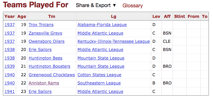 Nevertheless, Patterson joined a Rams team that managed a legitimate claim of optimism. Though the first-year Rams had floundered, the 1939 squad had posted a winning record (71-70) and lured Annistonians into believing it could challenge for the league title. Patterson, who’d won 18 games for the Class D team in Huntington, West Virginia, pitched well during the spring but then disappeared from the Rams’ rotation. Between opening day and his release on May 14, Patterson pinch hit once and pitched once in relief, giving up a hit and a run in two innings against Montgomery.