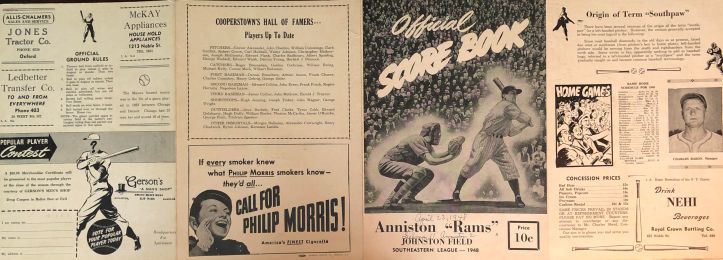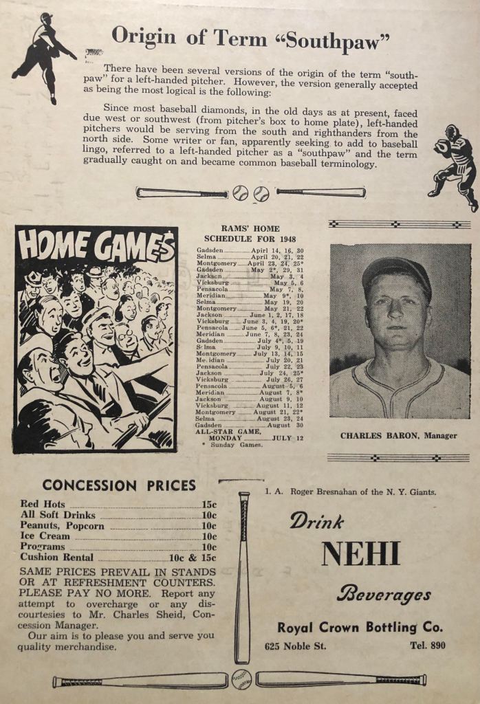 The second page features the Rams’ ’48 home schedule; a photograph of Charles Baron, Anniston’s manager; and Johnston Field’s concession prices. Bleacher cushion rentals cost 10 cents and 15 cents, though there’s no explanation of the difference: size or quality, or perhaps both?