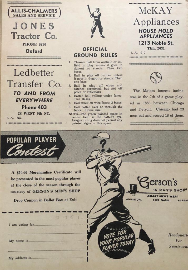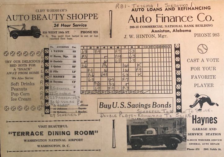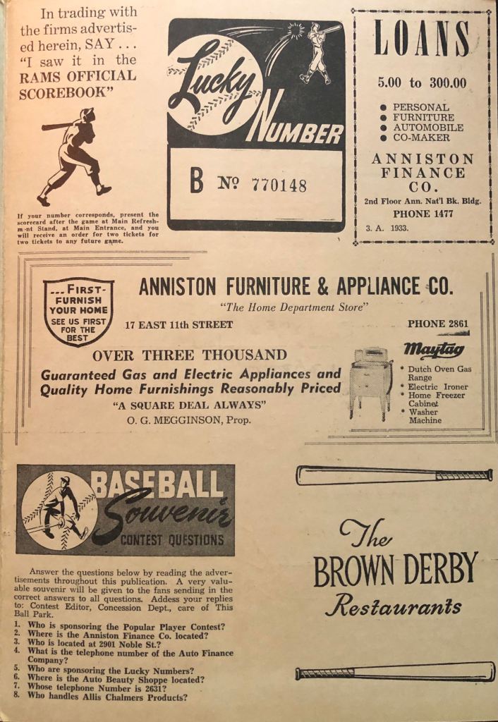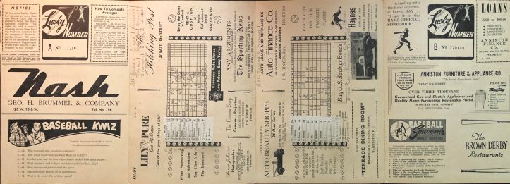 Scorecards, such as the one pictured above, can fill in those gaps. They’re troves of tidbits about games, concessions, in-game contests, advertisers and people who plopped down a few coins to watch Southeastern League games on Anniston’s east side.