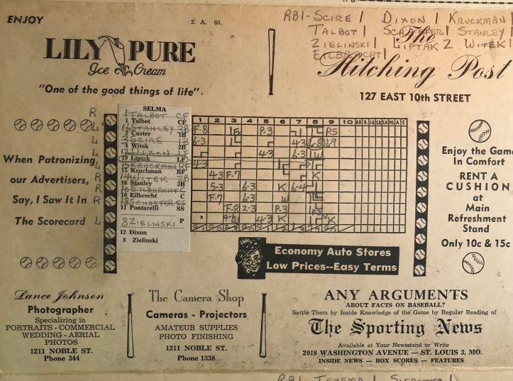 This one is from an April 22, 1948, game against Selma, which walloped the Rams that night, 11-2. Folded neatly, the scorecard is a bit smaller than an 8 1/2 by 11-inch sheet of paper, is printed on mid-weight card stock and uses only black ink. It features the original owner’s hand-written notes and tabulations — they kept score and recorded specific details, such as RBIs and which players were involved in double plays — but is otherwise in pristine condition. No doubt it sat dust-free in a desk drawer for seven decades.