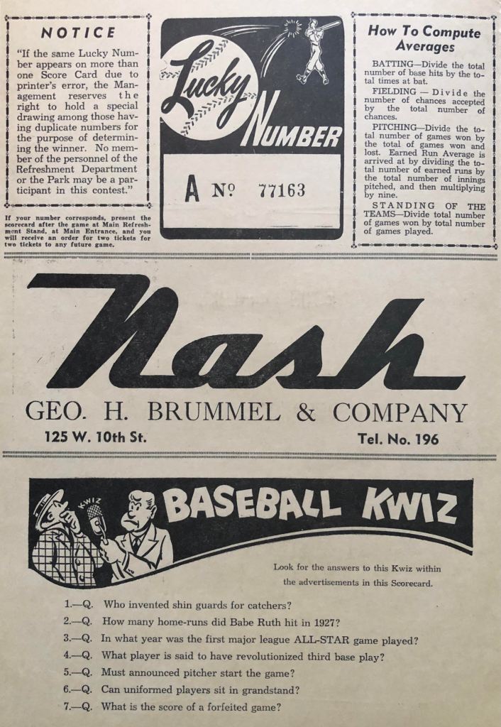 Page 3 presumably was the same each game, featuring a local advertisement, a baseball-themed quiz, a math lesson for batting averages, and one of the scorecard’s two lucky numbers.