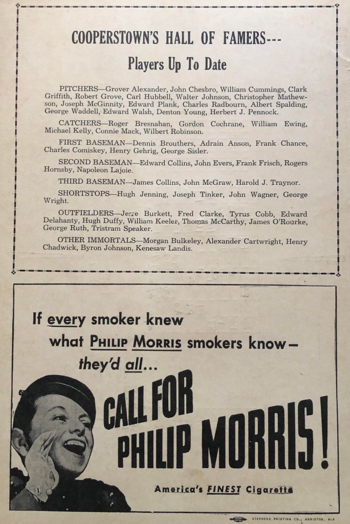 From a practical standpoint, the Rams’ 1948 scorecard is surprising in both design and information. Instead of a single sheet with rosters and room to keep score, this one folds out to display eight full-size pages, four to each side. The front cover (above) is boilerplate and doesn’t include the date. The back cover (below) includes a cigarette advertisement and an “up-to-date” list of Cooperstown enshrinees.