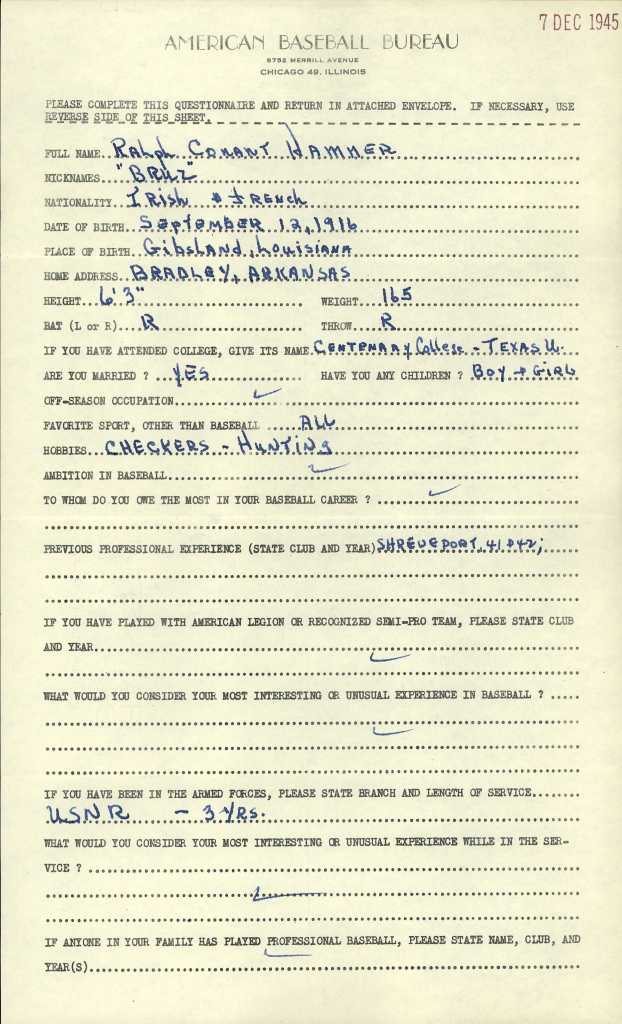 It’s impossible to know how different Hamner’s career would have been had it not been interrupted by World War II. (As was DiMaggio’s, though the Hall of Famer returned largely to form after the war.) He was 25 when he entered the U.S. Navy Reserves in December 1942. In his three previous seasons — in Anniston and Shreveport — he’d won 12, 14 and 19 games, a trend that caught scouts’ attention. Pitching for stateside military teams may have kept his arm in shape, but it certainly wasn’t the same as preparing for a potential MLB call-up.
