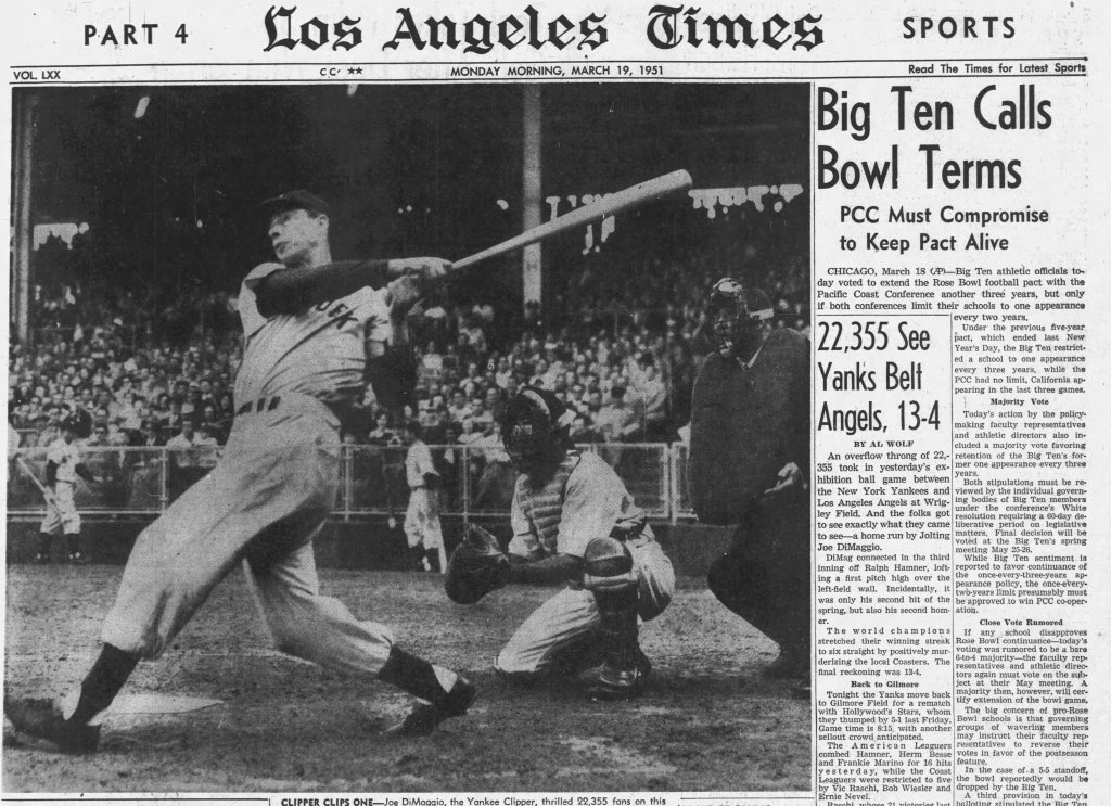 It was in March 1951, in the final spring training of Joe DiMaggio‘s illustrious career, when he dug in during the third inning of a New York Yankees game at Wrigley Field — in Los Angeles, not Chicago — against the minor-league Angels. More than 22,000 fans had sardined into the park, forcing several hundred to sit in hastily arranged on-field “corrals” and allow umpires to rule hit after hit as ground-rule doubles because they disappeared amid the congregated masses.