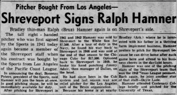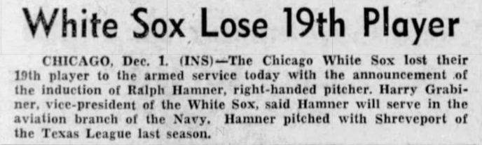 “Baseball is strictly for morale purposes for the armed forces here,” Hamner told The Shreveport Journal in 1943. “In some of our exhibition games we had more than 5,000 men in uniform present.” His health, though, a persistent problem before the war, didn’t improve in the Navy. He spent 20 days in the hospital with the mumps. He tore a muscle in his back when he tried to pitch too soon after his hospital stay. The Shreveport paper called him “frail,” a “thin man” and a “skinny chap” who suffered from a “perpetual stomach ache.” But he stayed in the Navy as a chief specialist and pitched when he could. Baseball remained on his radar.