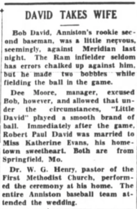 The future Mr. and Mrs. David set the date for May 19, a Tuesday. Three days prior, in a 7-6 home loss to Montgomery, the light-hitting David reached his Anniston apex — four hits and a noticeable show of support from Ted York, sports editor of The Anniston Star. In the next afternoon’s edition, York noted how David’s surprising performances that month had soothed the Rams’ disappointment from failing to land an infielder from Little Rock. “At first the blow to Anniston was severe, but Bob David, determined to say ‘I told you so,’ is keeping down the second base berth in such a style that no manager would dare bench him,” York wrote.
