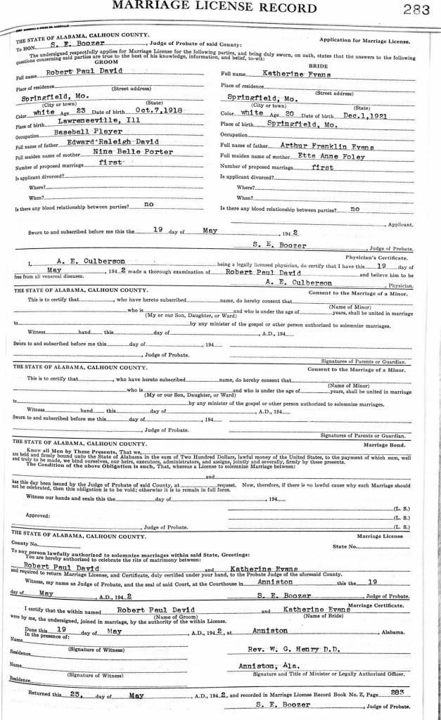 Born in Illinois, David was a diminutive second baseman from Mountain View, Missouri, who’d joined the Rams that spring and played basketball for Southwestern Institute (now the University of Louisiana at Lafayette) during the offseason. He’d chased his baseball dream since signing with the St. Louis Browns and joining his first professional team, a Class D outfit in Siloam Springs, Arkansas, in 1938. Moving to Anniston gave David his first shot in Class B, one step closer to the Major Leagues. But baseball couldn’t delay him from marrying his childhood sweetheart from Missouri, Katherine Evans.