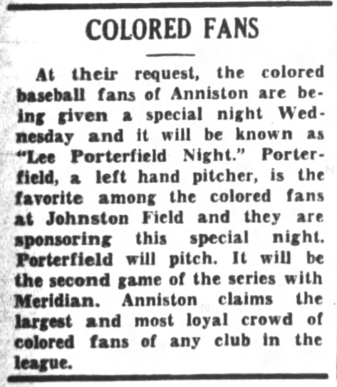 The Rams couldn’t have been happier with the result. Playoff-bound Anniston won, 2-1, as the Idahoan scattered nine hits, fanning 11 and allowing only a single run, and knocked in the game-winning tally with a double to left in the ninth inning. The serendipity, perhaps preordained, was hard to miss. As the winning run scored, “All the fans went wild with cheers, but the colored people rose as one and sounded a mighty hullabaloo for their choice because he had come through the battle with flying colors,” The Star wrote. After the game, Black fans gave Porterfield a Bulova watch and $65 they collected during the night.
