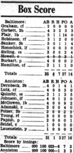 “The game itself was a joy to most Anniston supporters who realize that Manager Dick Porter has the makings for a really scrapping team, even at this early date of the season,” The Star wrote. Baltimore’s newspaper credited the Rams’ starter — “The Flock couldn’t do a thing” against Papish, it said — and highlighted the fact that it took a late Baltimore rally to upend an under-manned Southeastern League team.