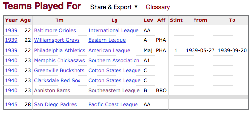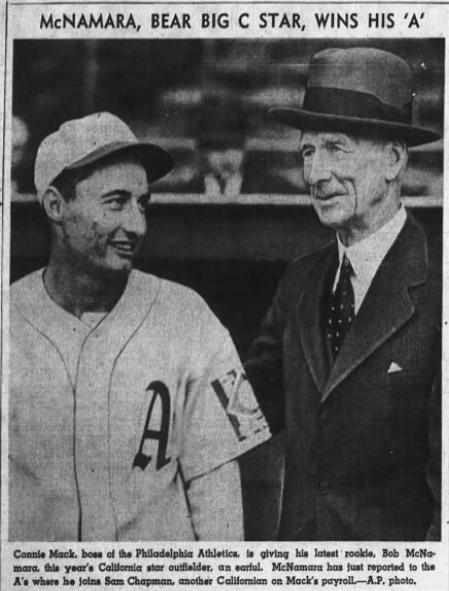 Philadelphia’s was the first of three uniforms McNamara would wear in 1939. Rogers Hornsby, the Orioles’ manager, gave McNamara “extra practice duty to bring him along,” according to the Baltimore Evening Sun, but the Hall of Famer had scant patience and sent him back to Mack, his stay in Baltimore lasting less than a week. Mack then optioned him to Williamsport, a Class A Eastern League team where he hit .238 in 39 games before the Athletics briefly recalled him in September, using him as a late-inning scrub in four meaningless games. Mack released McNamara a week early so he could return to Berkeley to finish his coursework and graduate from Cal.