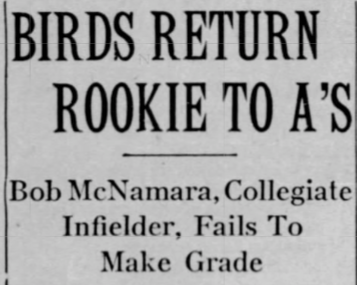 The following season essentially followed the same script. Assigned to Memphis during spring training, McNamara started 1940’s opener because the Chicks’ second baseman, Louis “Mickey Mouse” Bush, was injured. The Commercial Appeal newspaper was nevertheless unimpressed. A few days before the first game, it offered a blunt assessment: “Bob McNamara hasn’t set the camp on fire.”