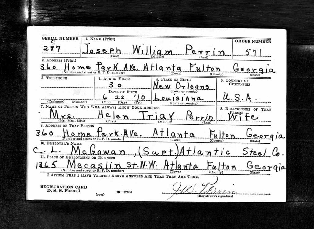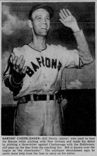 Entering his thirties, Perrin stubbornly refused to discard the game. He became a semi-pro standout for two summers in Atlanta, sweating at the steel plant during the day and pitching at night. When the struggling Birmingham Barons needed pitching in 1943, they brought Perrin back to organized baseball on June 11. Zipp Newman, the Birmingham News sports editor, remembered Perrin’s three stints with New Orleans and thought the lefty was worth the risk. “(Perrin) isn’t too old to be of help to the Barons … Bill has the experience and if he has his control, he can be an awful pain. He is by temperament a competitor — a hard loser.” Newman didn’t mention that Perrin’s cousin, Jimmy Perrin, was a noted featherweight boxer and nearly made the 1932 U.S. Olympic team.