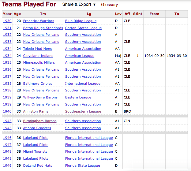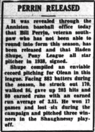 The Bill Perrin who arrived in Anniston early in the 1940 season was a 30-year-old journeyman who’d bopped around Cleveland’s farm system since 1930, collecting uniforms along the way: first Frederick, Maryland, then Baton Rouge, Toledo, New Orleans (three times), Minneapolis, Baltimore and Wilkes-Barre. Tucked among those minor-league seasons were his one appearance with the Indians and an unproductive stint in Cleveland’s spring training camp in 1933. The Rams didn’t get a pitcher legitimately chasing another Major League opportunity. They acquired a veteran minor-leaguer with a decent curve and a heralded pick-off move and a desire to rescue his career from its downward trend.