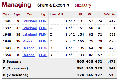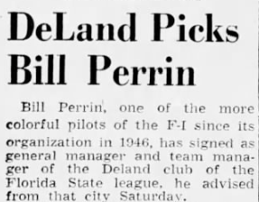 Perrin’s stay in Birmingham, however, mimicked his uneventful tenure in Anniston. He made 17 appearances for the Barons, middling at best, and was released Aug. 3. Signed immediately by Atlanta, Perrin did no better for the Crackers, giving up 13 hits and five earned runs in seven innings against Nashville. He’d get only seven more appearances in Atlanta before season’s end. Cut loose by the Crackers, he returned to his factory job and his semi-pro pitching gig until jumping at the chance to manage in the Florida International League, first with Lakeland in 1946, then with Miami in 1948. His second DeLand team won the Florida State League championship in 1950, his final year in professional baseball.