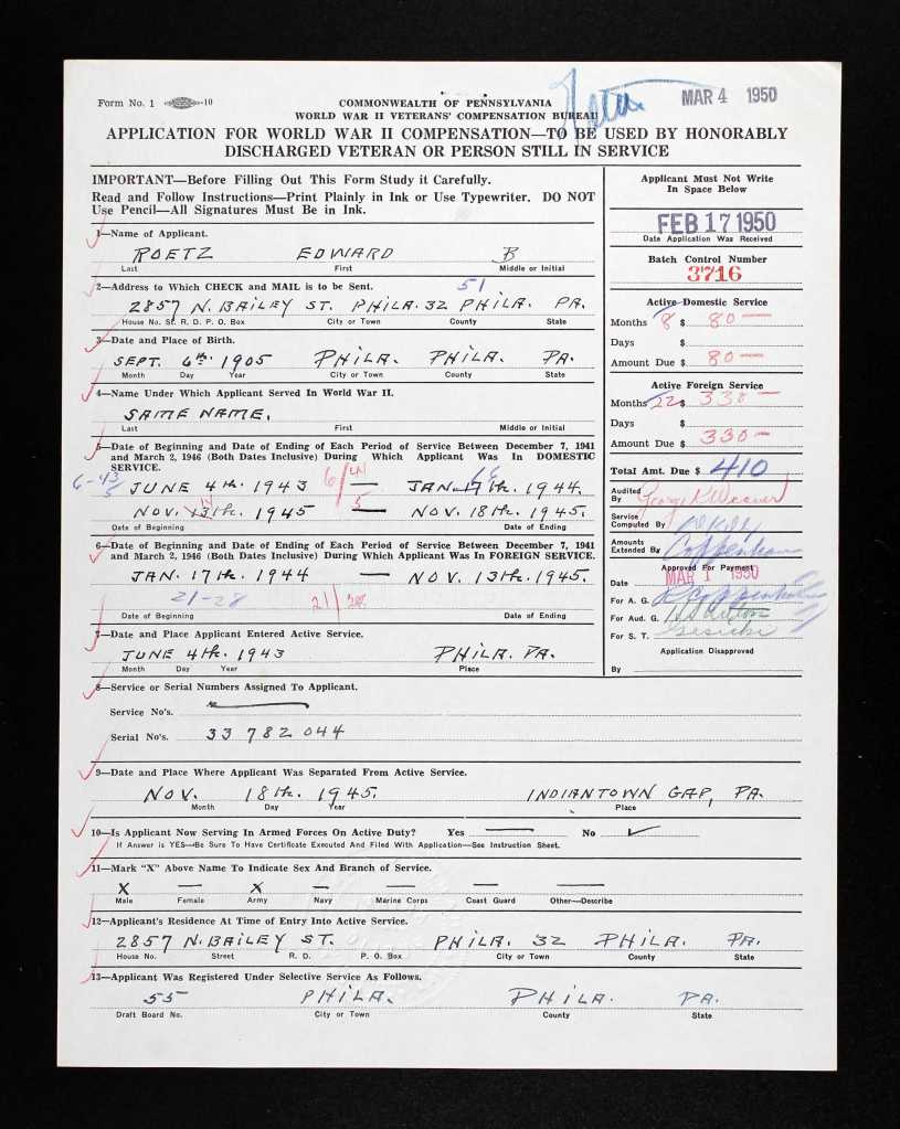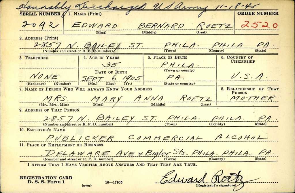 Discharged in November 1945, Roetz returned to Philadelphia and worked as a carpenter. A lifelong bachelor who had no children, he shared a house with his oldest brother John, who also never married, for several years. He was 59 years old when he died in 1965. His family buried him in a military grave in Beverly National Cemetery in Beverly, New Jersey.