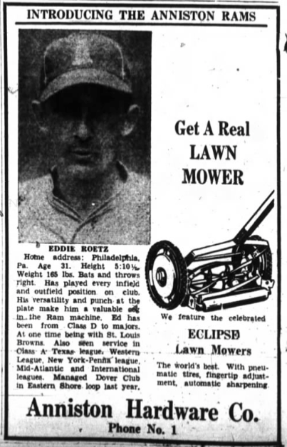 Opinions regarding his arrival in Anniston in 1938 depended on perspective. What was Ed Roetz? A veteran infielder with a potent bat who would provide the SEL expansion team an everyday presence? Or an aging infielder who’d fizzled in his brief Major League tryout and spent two seasons as a retiree because of arm troubles? The Rams hoped he was the former.