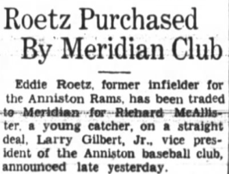 What’s worse, the Rams didn’t want him for a third season. Age trumped output. In February, they shipped him to Meridian for Richard McAllister, a young catcher who’d never wear an Anniston uniform. Likewise, Roetz would never play for the Mississippi team.
