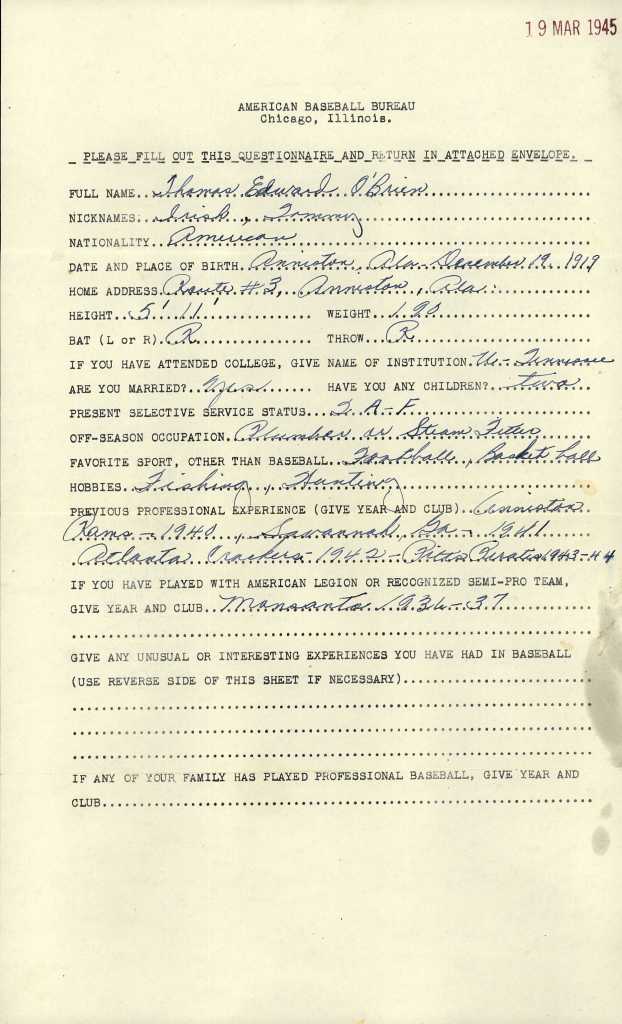 The proof is jarring. O’Brien, who avoided the draft when a military doctor deemed one of his knees too balky for service, played 232 games over three wartime seasons with the Pirates. He singled to center against the Chicago Cubs in his first MLB at-bat; two months later, he recorded seven hits, including two doubles and two triples, in a doubleheader against the New York Giants. He twice hit better than .300 despite limited playing time. But in 1946, the first full season after hostilities’ end, O’Brien was shoved back to the minors, where he’d stay until 1949, a victim of the postwar return of baseball’s talent.